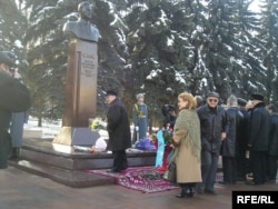 Дінмұхамед Қонаевтың туған күні оның рухына тағзым етіп ескерткішіне келгендер. Алматы, 12 қаңтар 2009 жыл.