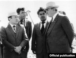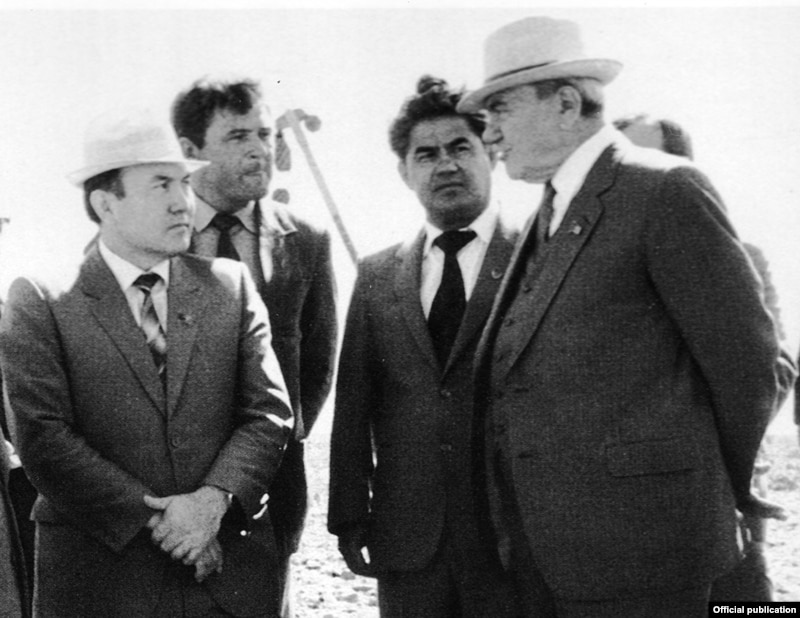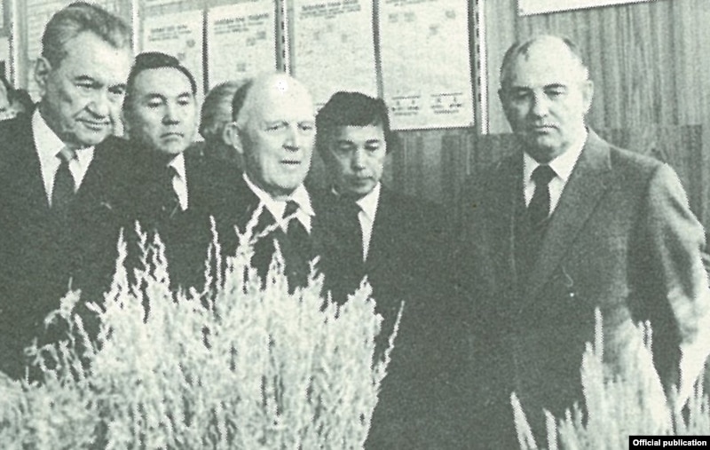Қазақстан Компартиясы Орталық Комитетінің бірінші хатшысы Дінмұхамед Қонаев (сол жақта), Қазақ ССР Министрлер Кеңесінің төрағасы Нұрсұлтан Назарбаев (сол жақтан екінші), СОКП Орталық Комитетінің бас хатшысы Михаил Горбачев (оң жақта). Целиноград,1985 жыл.