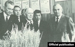 Қазақстан Компартиясы ОК-нің бірінші хатшысы Дінмұхамед Қонаев, Қазақ ССР Министрлер кеңесінің төрағасы Нұрсұлтан Назарбаев (сол жақ шеткі), СОКП ОК бас хатшысы Михаил Горбачев (оң жақ шеткі). Целиноград, 1985 жыл.